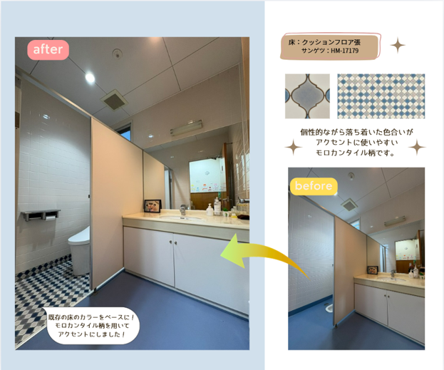 手洗スペース側の床は既存のまま残して、便器側のみをクッションフロアで上張りさせていだたきました♪